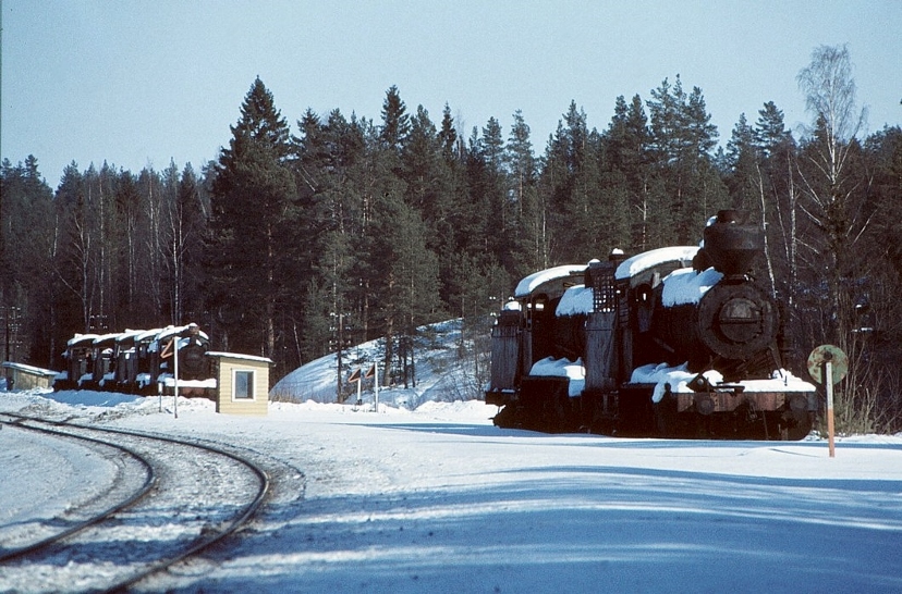 Jukka Martio kuvasi maaliskuussa 1980: "Metsolahden sivuraiteella odottivat täysinpalvelleet vetojuhdat viimeistä matkaansa. Vieressä kaartuu rata Pönttövuoreen." * käyttölupa 2016-1-G, kiitos.