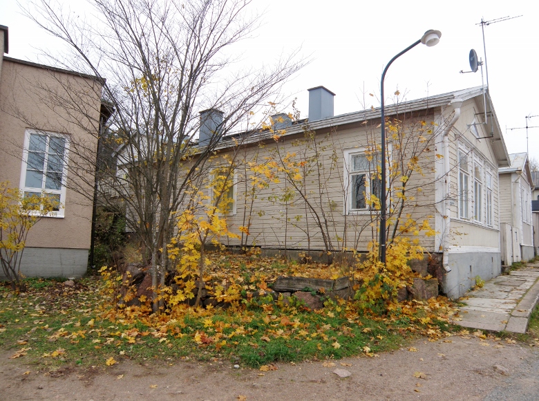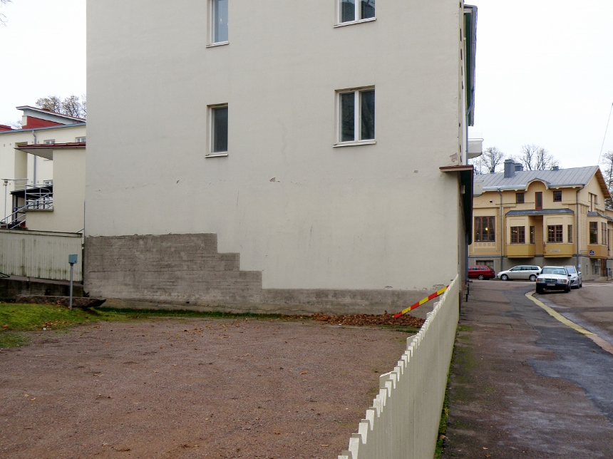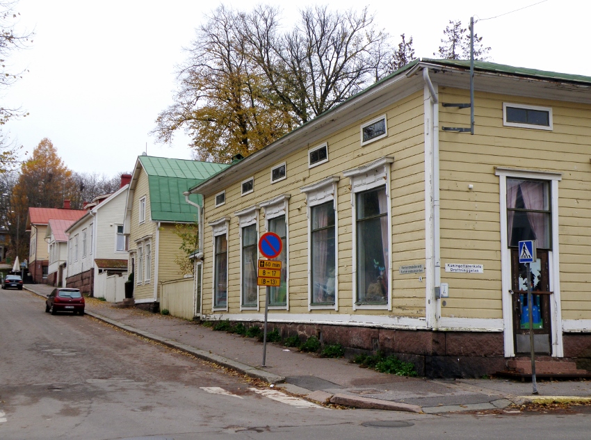 Sama paikka kuvattuna 26.10.2011 (S&J). Kulman taakse keltaisen talon editse erkanee siis Mariankatu. Keltainen rakennus oikealla on ns. Rosqvistin talo (Mariankatu 3).