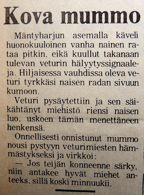 (Perinnealbumi, 1981): Kun ensimmäinen höyryveturi v.1862 puksutteli Helsingistä Hämeenlinnaan, alkoi Suomessa nopea rautateiden rakentamiskausi. Mäntyharju pääsi osalliseksi tästä kehityksestä v.1889, jolloin pitäjän poikki kulkeva Savon rata avattin liikenteelle.