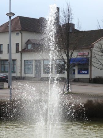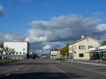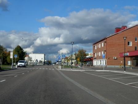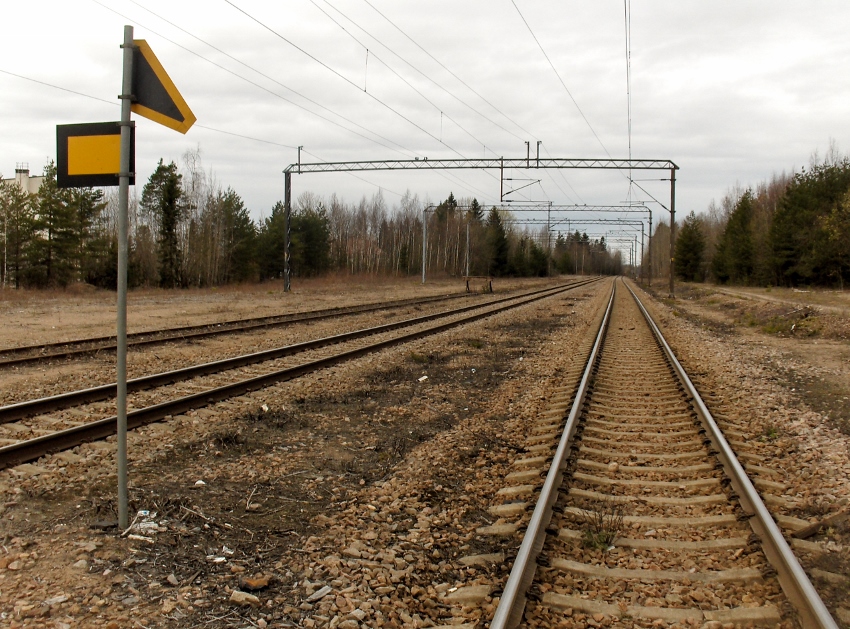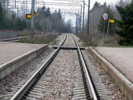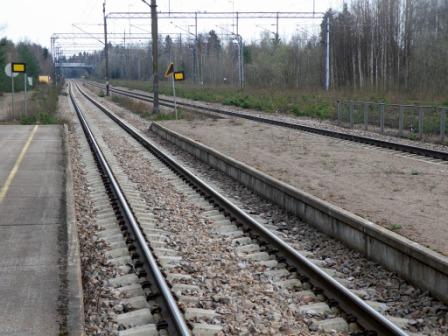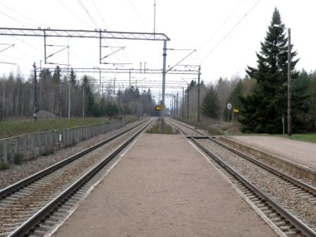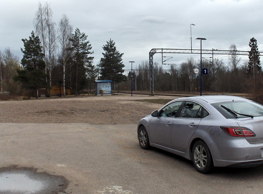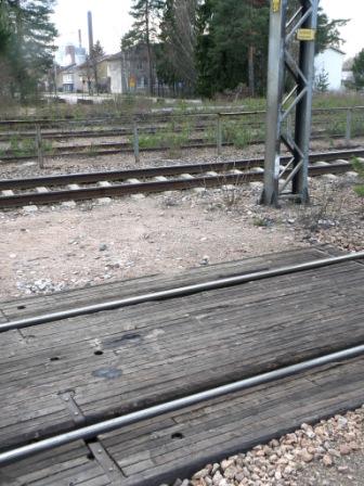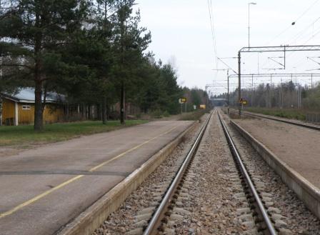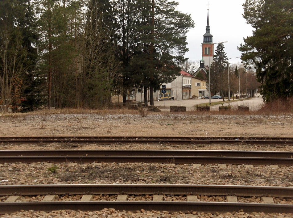 Näkymä Myllykosken puretun rautatieaseman ratapihalta kohti kirkkoa, hiljainen on kylätie - 20.4.2015 (S&J).