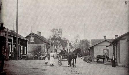 Pieksämäen Kirkkotien näkymä vuodelta 1915. Edla ja Eeti Saarinen ovat tulleet noutamaan postia posteljooni Wauhkoselta. Vasemmalla Tienristin punainen tavaratalo eli W.A.Winbladin kauppakartano, joka sijaitsi Kirkkotien ja Savontien risteyksessä. Oikealla A.Wauhkosen perillisten kaupparakennus (Perinnealbumi - E.J.Saarinen).