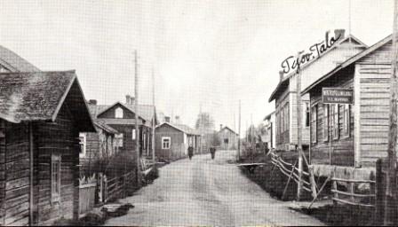 Näkymä Pirttimäentieltä vuonna 1915. (Perinnealbumi - E.J.Saarinen). Oikealla edessä V.E.Mannisen räätälinliike ja sen takana seuraavana työväentalo, jota kohtasi täydellinen hävitys kansalaissodassa kuten mikkeliläinen Vapaus-lehti asian ilmaisi heinäkuussa 1918. Työväentaloa vastapäätä sijaitsi Pieksämäen ensimmäinen leipomo, jonka omisti Mikko Frilander eli "Mikko-Pakari".