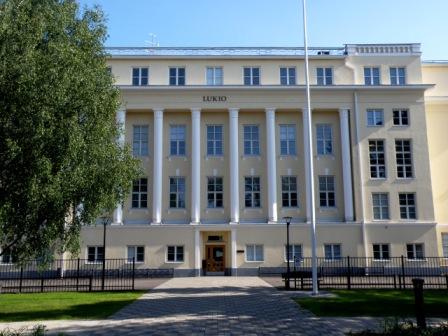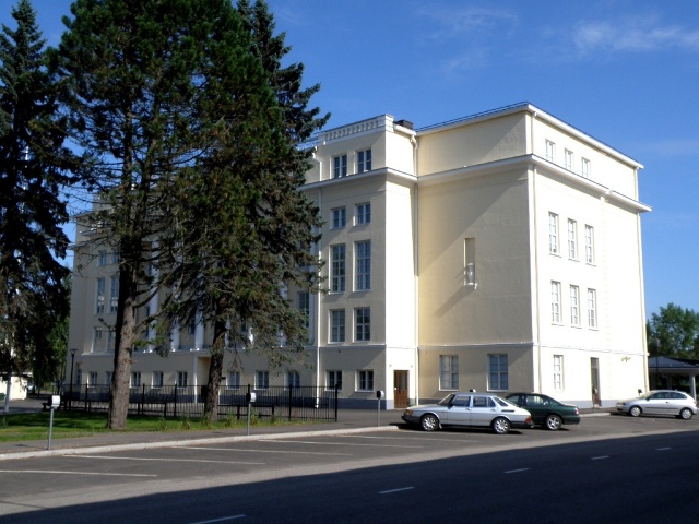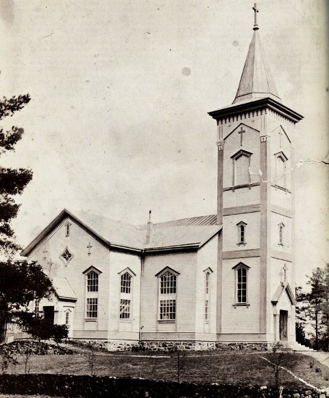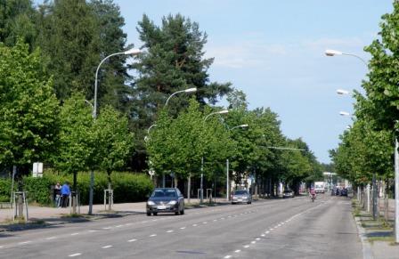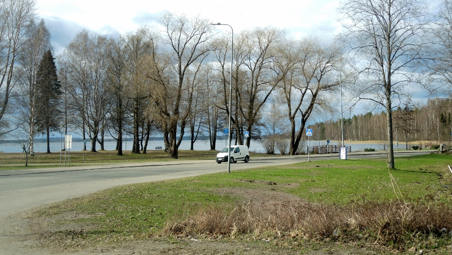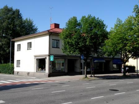 Sama paikka kuvattuna vuonna 1915 kuin edellisessäkin kuvassa - Pieksämäen Kirkkotien ja Savontien risteys eli ns. Tienristi (Perinnealbumi - E.J.Saarinen). Edessä oikealla näkyy yhteiskoulu, joka aloitti toimintansa tässä Winbladin omistamassa rakennuksessa vuonna 1909. Yhteiskoulun ja Wauhkosen perikunnan rakennusten välissä kulkee Jyväskylästä päin tuleva ja asemalle vievä Savontie, joka katkaisee Kirkkotien. Kuva on otettu Kirkkotiellä Mikkelin suunnasta Kuopioon päin.