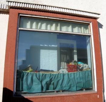 Otto Karjalaisen valokuvaamo Pieksämäellä 1920-luvun alkupuoliskolta. Mainoskaapeissa on näytekuvia sekä kehysmalleja. Itse kuvaamoateljee sijaitsi yläkerrassa, minne oli hyvän kuvausvalaistuksen saamiseksi rakennettu suuret seinä- ja kattoikkunat.