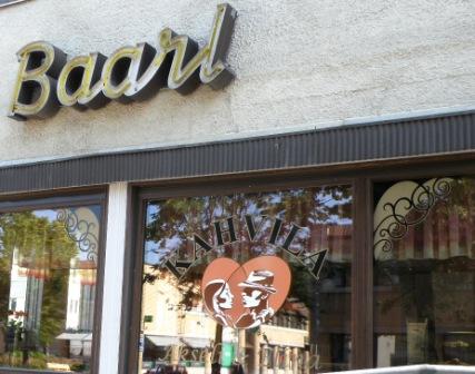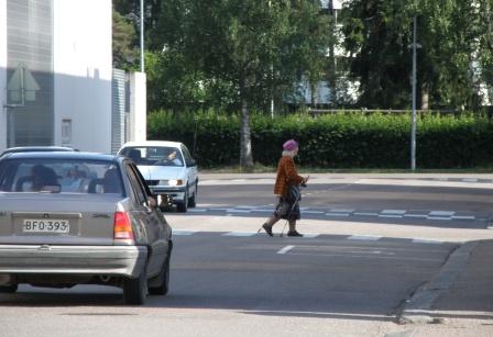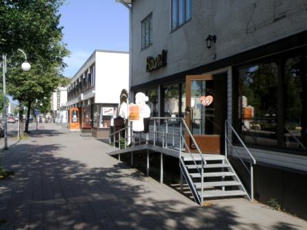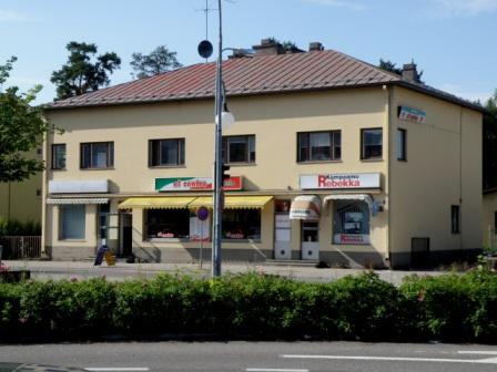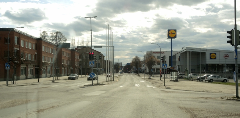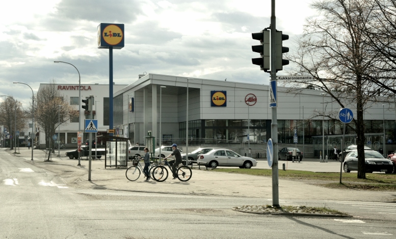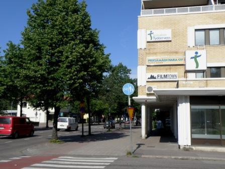 Kuvassa näkyvän risteyksen opasviitoissa lukee Vaatetusliike, Bentsiiniä ja Parturi.