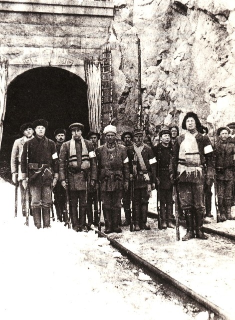 Tämä kuva on peräisin Juha Siltalan kirjasta Sisällissodan psykohistoria (Otava, 2009). Kuvassa on valkoisten osasto vartiotehtävissä Pönttövuoren tunnelin suulla. Tunneliaukon yläreunassa näkyvissä ranentamisvuodet: 1914-1917.