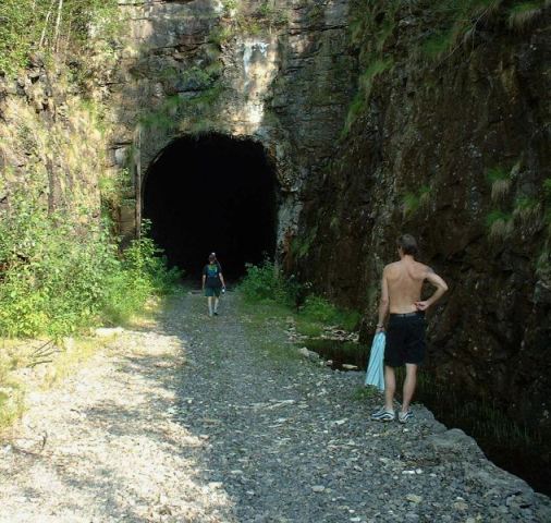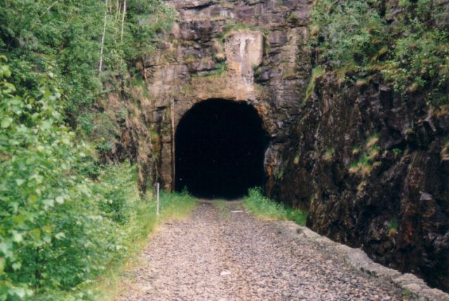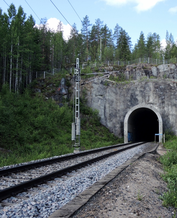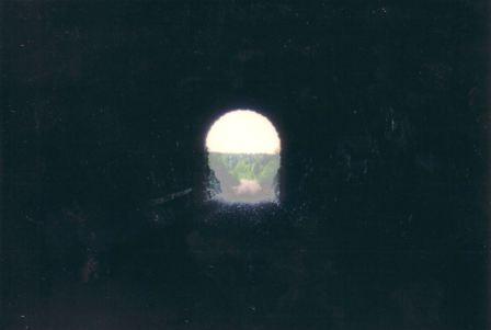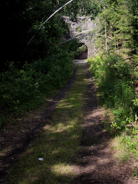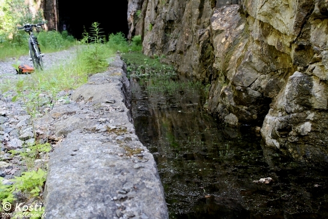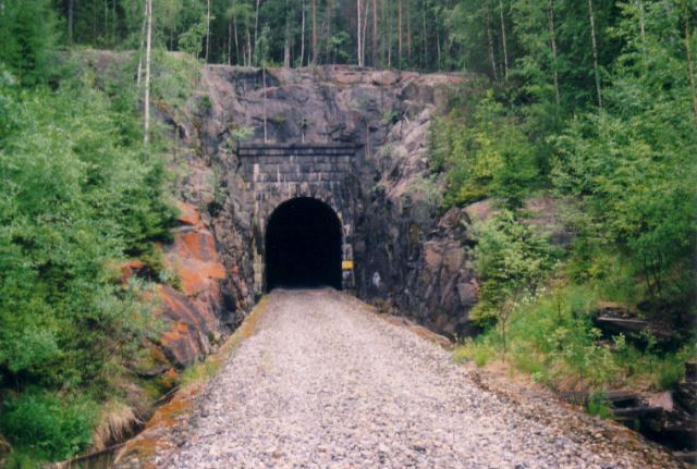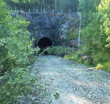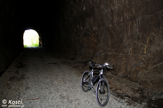 Seurasin siis vähän aikaa hiekkatietä , ja äkkiä tunnelinsuu tupsahti mutkan takaa esiin. Rata on tehnyt yllättävän jyrkän mutkan ennen tunnelia. Aukko on paljon pienempi, kuin olin kuvitellut, ja on lievästi sanottuna luotaan työntävän näköinen. Ei siis muuta kuin sisään. Paikka on kylmä, kostea ja tuoksuu ummehtuneelta. Luonnonvalo katoaa tunnelissa muutamassa kymmenessä metrissä. Samalla edessä tulee näkyviin kaukainen valopiste, joka on tunnelin toinen pää.