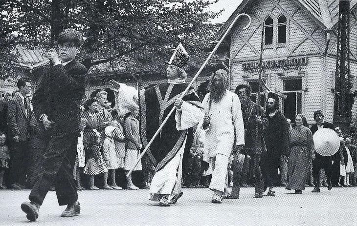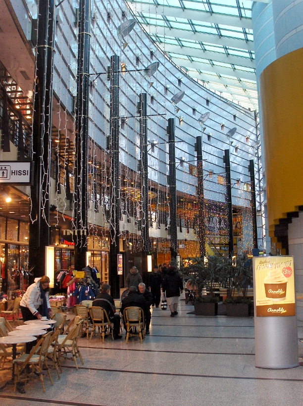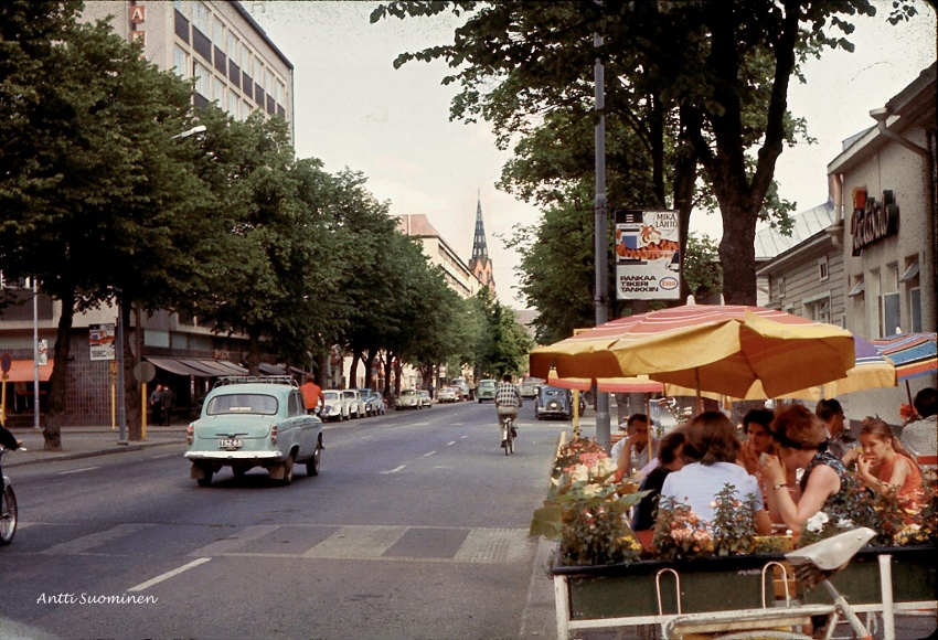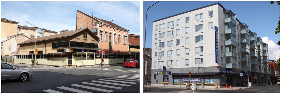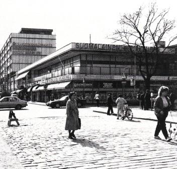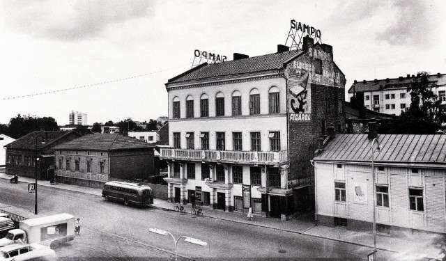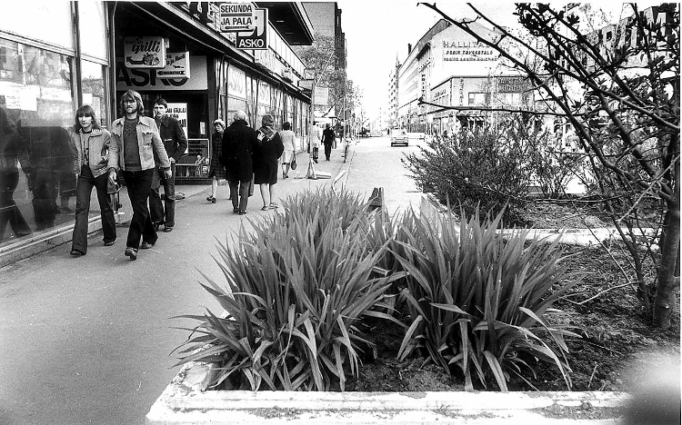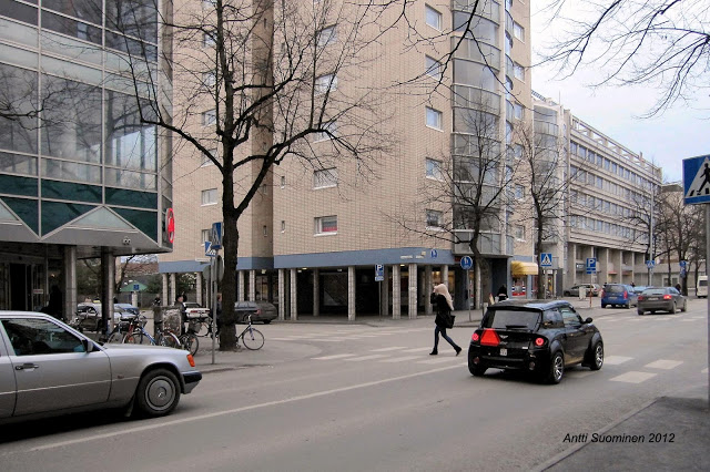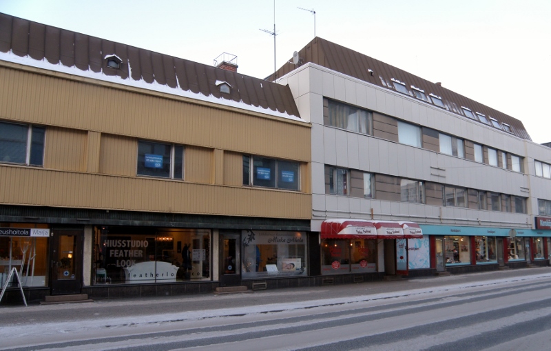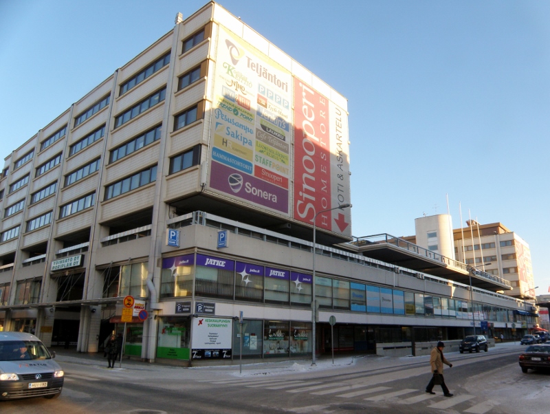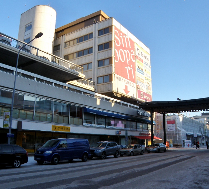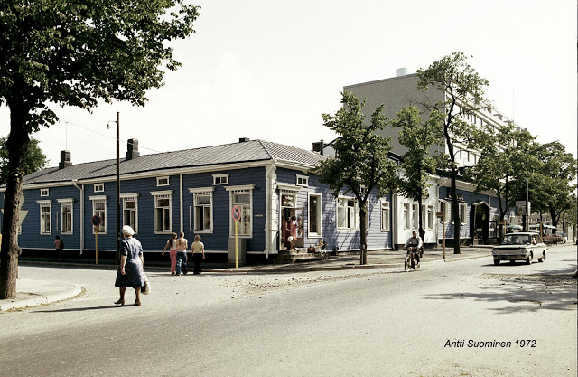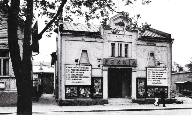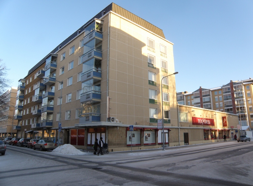Liisankadun ja Eteläpuiston koilliskulman kerrostalon alakerrassa sijaitsi aikoinaan elokuvateatteri, joka aloitti nimellä Allotria ja jatkoi loppuunsa asti nimellä Jaarli. Sen tiloihin tuli jo yli 25 vuotta sitten tekstiilimyymälä TexPörssi. Kuvattu 23.1.2014 (S&J). Sisäänkäynti Jaarliin oli lastenvaunuja kuvassa työntävän pariskunnan kohdalla. Näytöksen jälkeen poistuttiin äärioikealta, matalamman näyttämösiiven ovesta. Toinen, varmasti vieläkin legendaarisempi elokuvateatteri Fennia sijaitsi Jaarlin pohjoisnaapurina pienessä eksoottisessa kivitalossa purkamiseensa asti (kesä 1969) - tarkemmin alempana tällä sivulla.