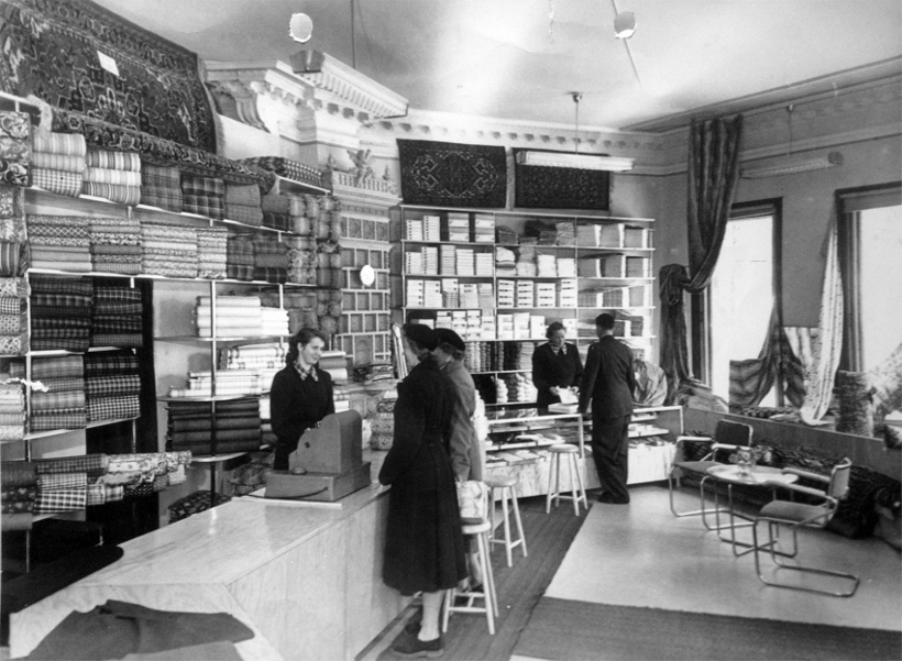 ja naisten kauempana hämyssä vaatenaulakoiden takana.