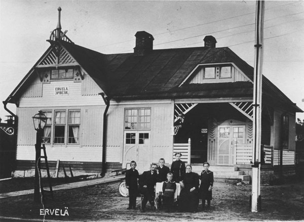 (A.Korhonen, 2006): Ratavartija Willberg-Vuorisalon perhe potretissa Ervelän odotusvajan alkuperäisellä paikalla. Tunnistettujen henkilöiden perusteella valokuva on todennäköisesti otettu vuonna 1913. Huomaa kattoratsastaja, postin pakaasiovet ja ramppi, lyhdyt, kattomateriaali, talon väritys sekä lasten asut!