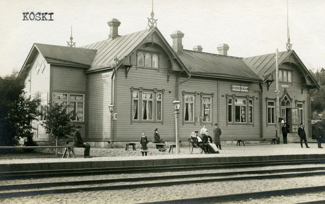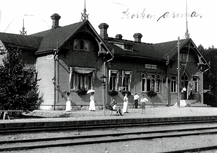 Kosken asemarakennus kuvapostikortissa n. 1910. Tämä asema tuhoutui talvisodan pommituksissa. Antti Roivaisen kokoelmista - Radan varrella-kirja, 2009.