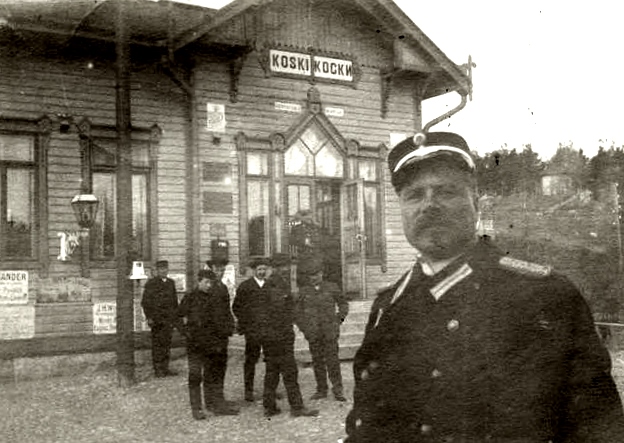Konduktööri Stén Kosken vanhalla rautatieasemalla. Taustalla asemarakennuksen portailla näkyy toinen virkapukuinen rautatieläinen sekä aseman edessä miesjoukko. Finna ~ kuvan käyttöoikeudet: CC BY-NC-ND 4.0.