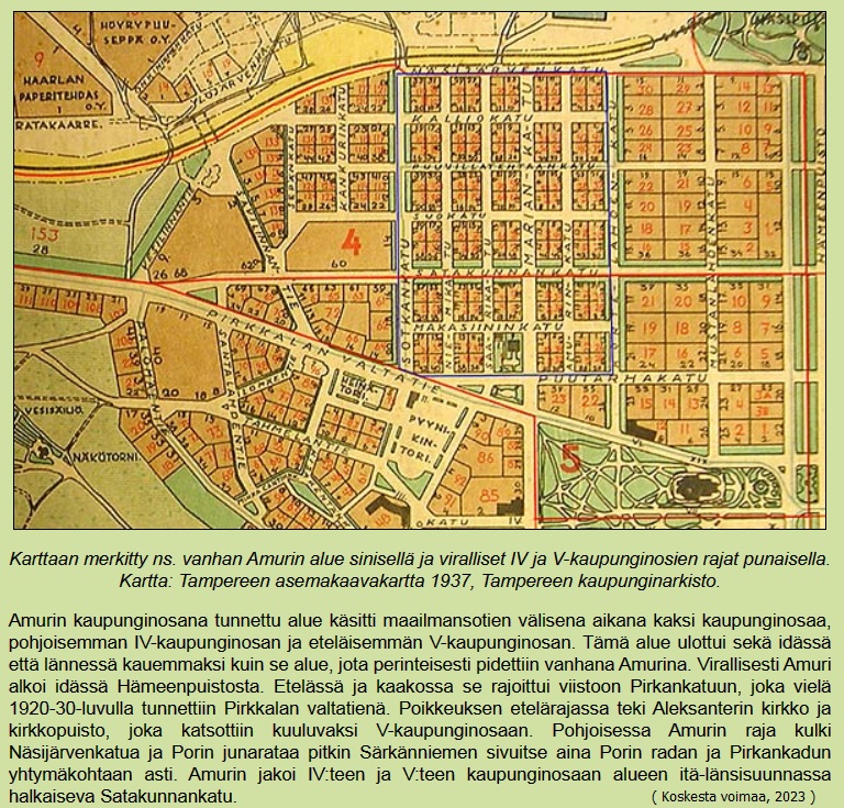 (Wikipedia, 2023): Amuri on kahden kaupunginosan muodostama alue Tampereella. Se jakaantuu Satakunnankadun pohjoispuoliseen 4. (Amuri A) ja eteläpuoliseen 5. (Amuri B) kaupunginosiin.