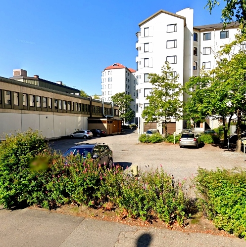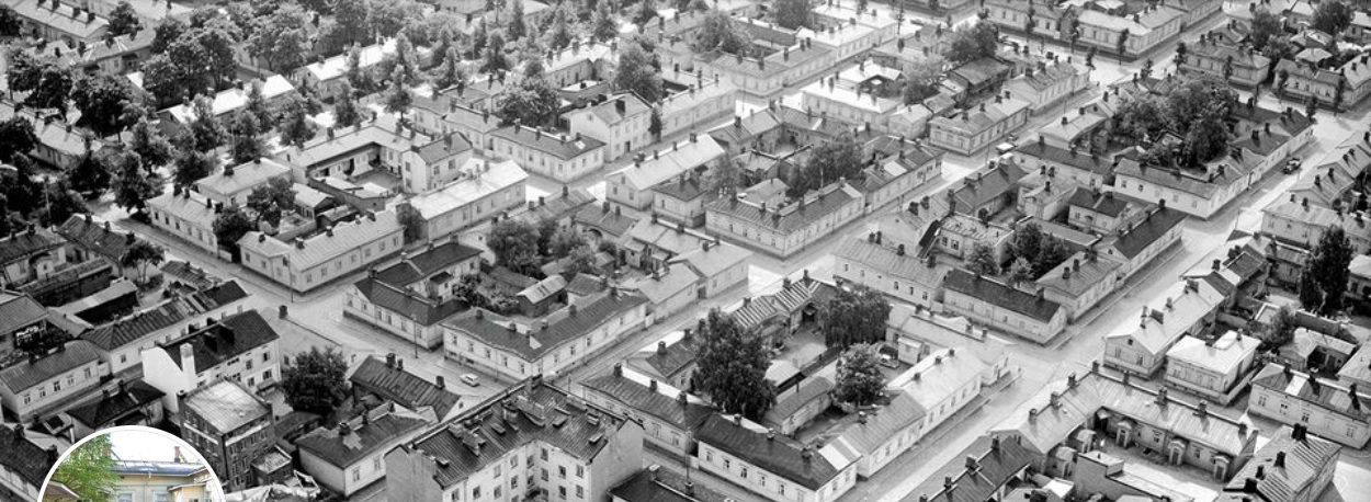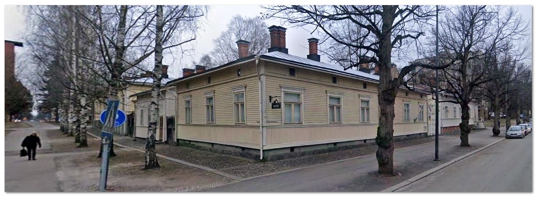 Kehitykseltä säästetty Amurin työläiskortteli (museo) Satakunnankadun eteläreunalla. Taaemmassa kulmassa oikealla Amurin kahvila * Google Maps-kuva joulukuulta 2020.