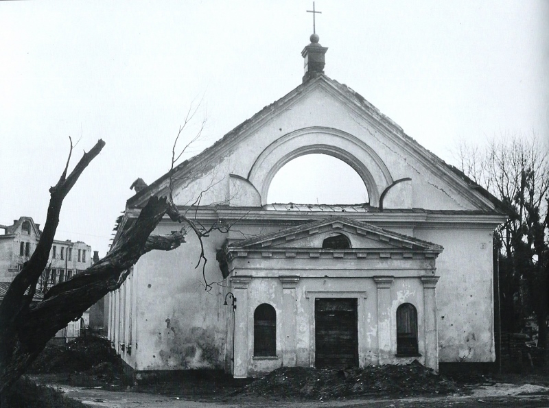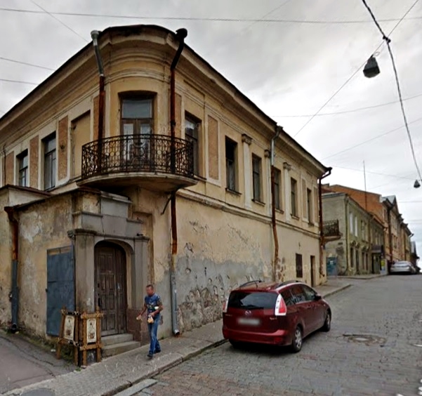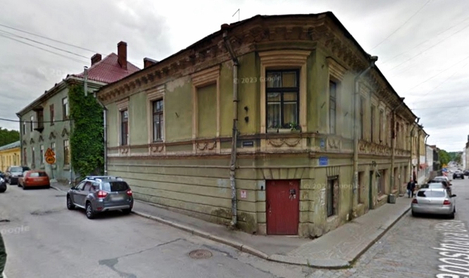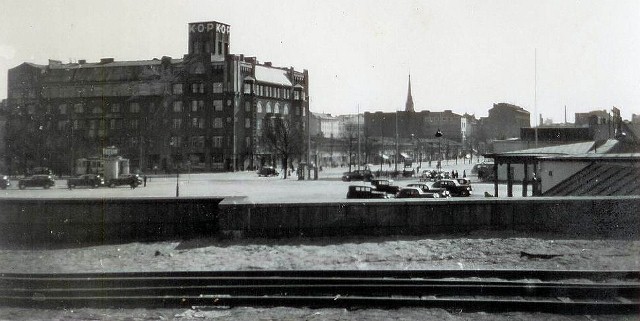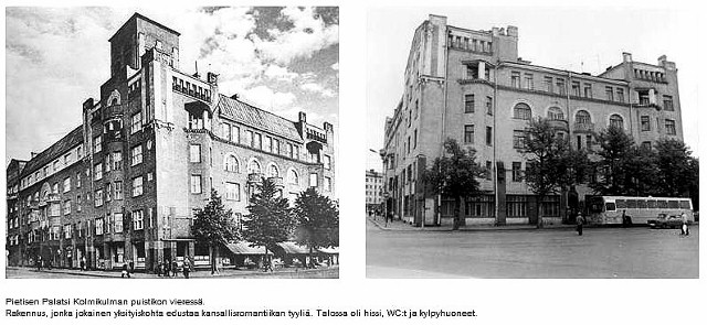 Viipurin KOP-pankkitalo (Pietisen palatsi) radan varressa - Kolmikulman puistikon vieressä, vasemmalla erottuu sitruunankeltainen raitiovaunu pysäkillä. Taustalla erottuu tuomiokirkon torni ~ katosi maisemista 1941 keväällä. Venäläiset räjäyttivät loput pyhäköstä v. 1948 rauhan tultua. Lähetti A.Välimäki 8.9.2012.