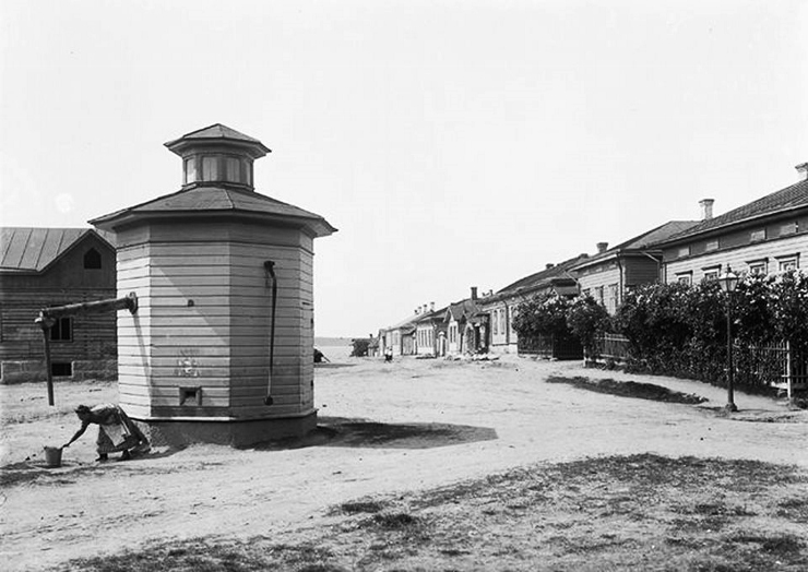 Neitsytniemi. Palotorin kaivo. Näkymä Konstantiininkatua (myöhemmin Merikatu) pitkin Suomenvedenselälle. Kuvan oikeassa reunassa Konstantiininkatu 14. Tontilla kaksi rakennusta jotka vuonna 1847 rakennettu. Kaivon takana Matinkatu 1, kauppias P. J. Worontzoffin vielä keskeneräinen asuin- ja puotirakennus. Kuva: M. L. Carstens, 1908.