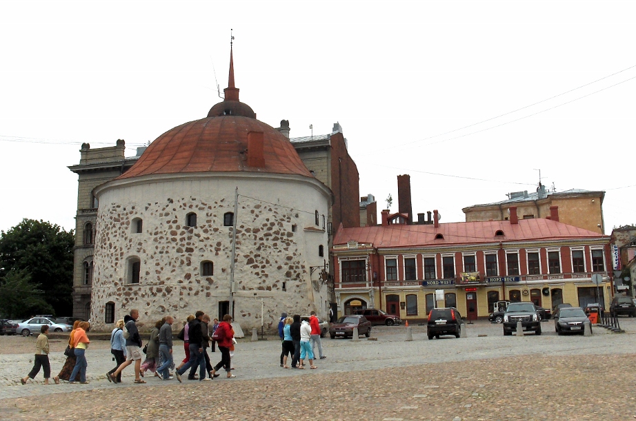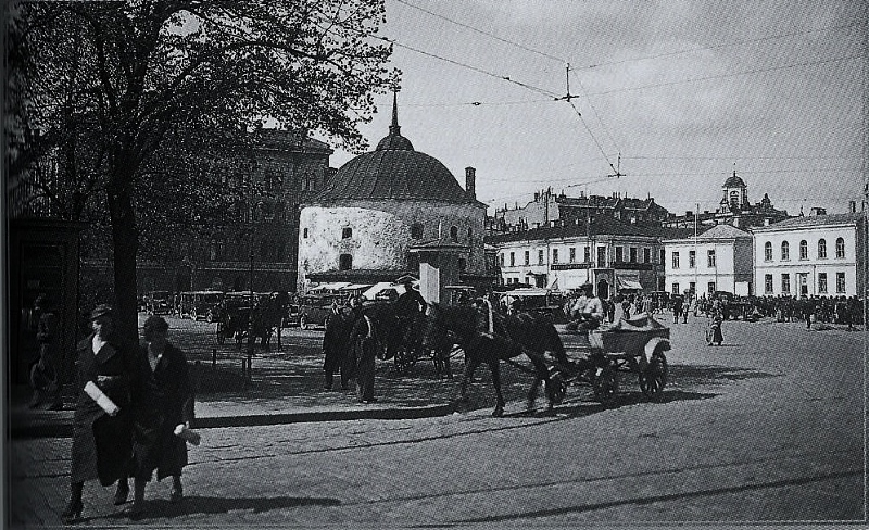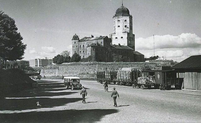 Kauppatorin laidalla sijaitseva Pyöreä torni oli eräs Viipurin maamerkeistä ennen sotia. Rakennus oli alkujaan 1500-luvun tykkitorni. 1930-luvun lopulla tornin kyljessä oli suosittu puinen kahvila Toripässi. Tämä Eino Partasen ottama kuva on Antero Raevuoren kirjasta 'Hyvästi, Viipuri' (2011).