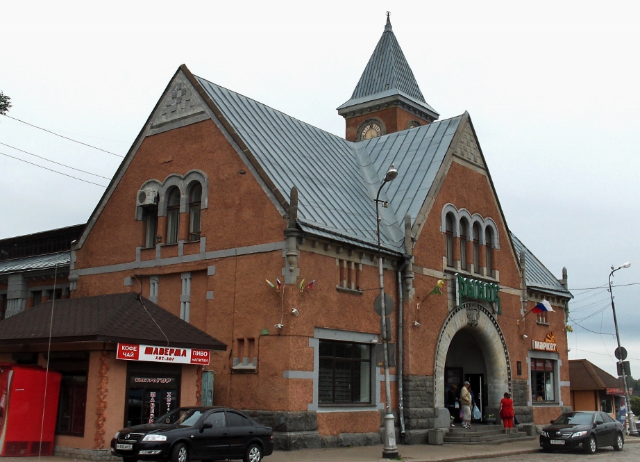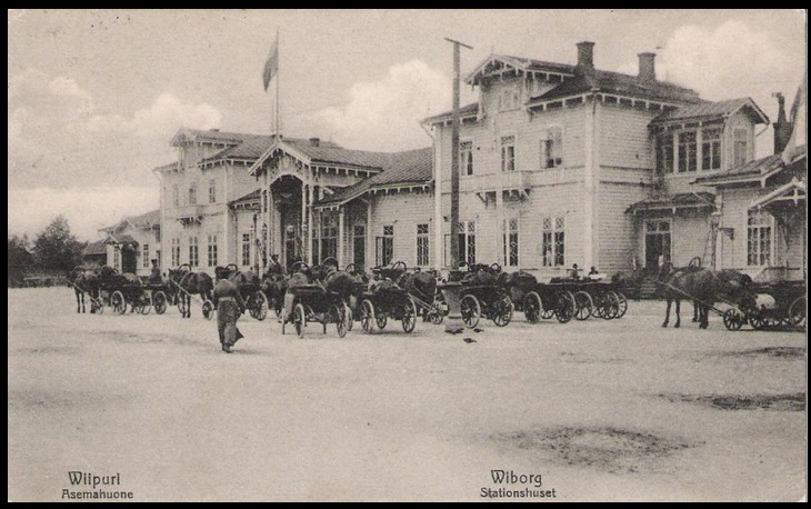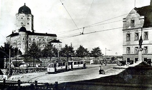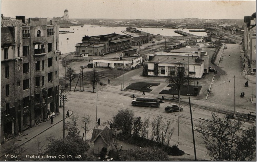 Postikorttimaisema Viipurista vuodelta 1942 - JR (11.1.2009): Jatkosodan aikainen Viipurin Kolmikulma. Etualan pääkatu on Mannerheiminkatu, jossa on Papulan ja Ristimäen raitiotielinjojen rautatieaseman pysäkin laiturit oikealla, ja raitiotien takana on Salakkalahdelle vievä satamaraide. Viipurin satamien "Kiertorata" tulee oikealta asemalta ja jatkuu vasemmalle kiertäen Pohjoissataman, Eteläsataman ja ohittaen mm. Havin yms. sekä palaa Viipurin ratapihalle kierrettyään siten koko kaupungin. Vasemmalla oleva katu on nimeltään Kolmikulma ja linja-autoaseman viertä kulkee puolestaan Revonkatu.