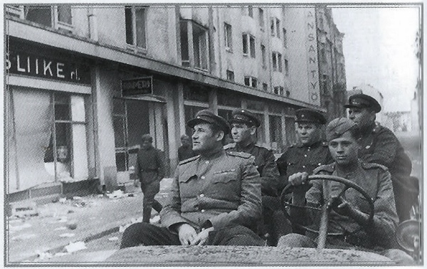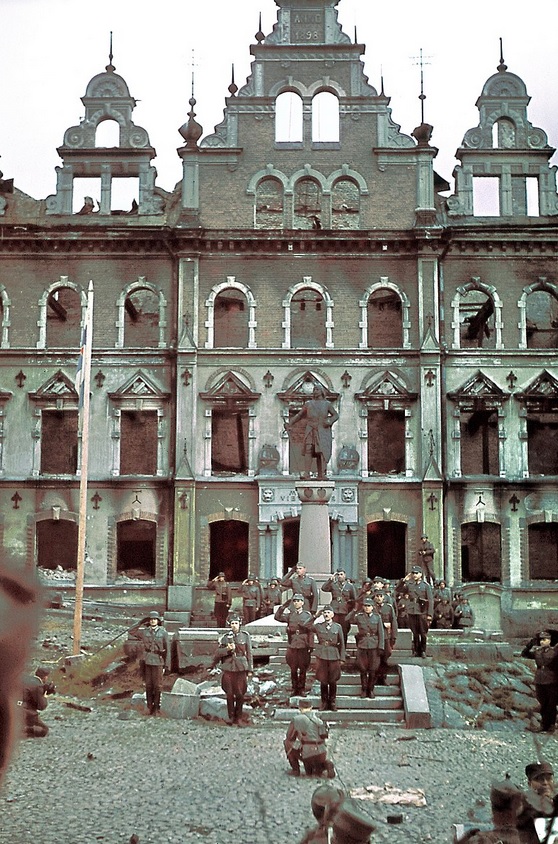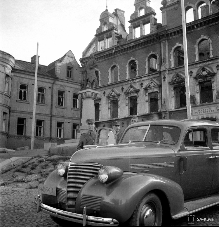 Viipurin takaisinvaltauksen paraati Torkkeli Knuutinpojan patsaalla 31. elokuuta 1941. Keskellä paraatia vastanottanut Lennart Oesch, vasemmalla kypärä päässään eversti Aladar Paasonen.