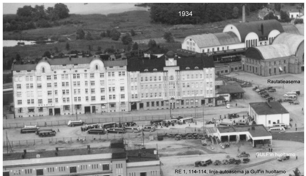 Viipurin linja-autoasema (1934) ja viereinen Gulf-huoltoasema - rautatieasema oikealla (Finna * Virt.Viipuri).