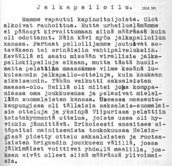Sodan melskeet jatkuivat kolme kuukautta - kesän urheilutoiminta alkoi haparoivasti, mutta 20.10.1918 Viipurin Reippaan jalkapalloilijat pelasivat jo Helsingissä SM-cupin finaalissa, missä HJK kuitenkin oli luvuin 3-0 parempi.