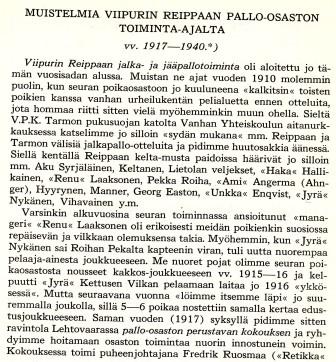 Tästä kohdasta Viipurin Reippaan historiikki hyppääkin alempana oleviin vuosittaisiin kausikohtaisiin osioihin.