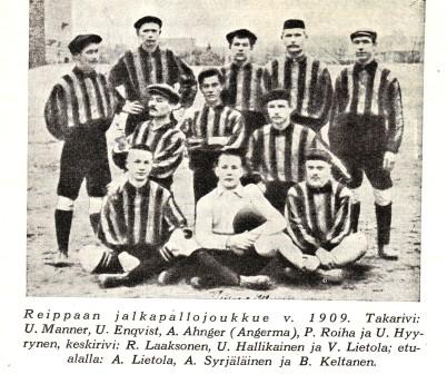 Tässä Viipurin Reippaan 60-vuotisjuhlakirjassa (1959) julkaistussa kuvassa poseeraa seuran vuoden 1909 uljas jalkapallomiehistö. Huomiota kiinnittänevät ensimmäisenä nuo mainiot päähineet. Pelaajien nimet erottunevat näytöltä.