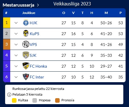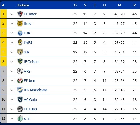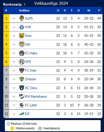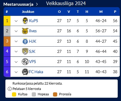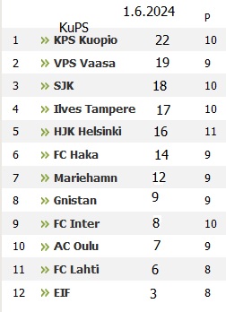 Sarjan kärjessä oleva hallitseva mestari KuPS on karannut jo 12 pisteen päähän.