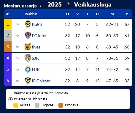 Veikkausliigan yläloppusarjassa (Mestaruussarja) KuPS keräsi 23 pistettä kymmenestä ottelusta - muut: SJK 18, FC Inter ja Ilves 15 sekä helsinkiläiset Gnistan ja HJK - molemmat 5 pistettä!