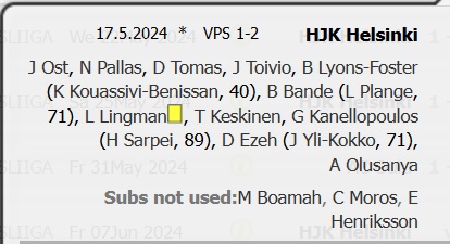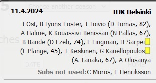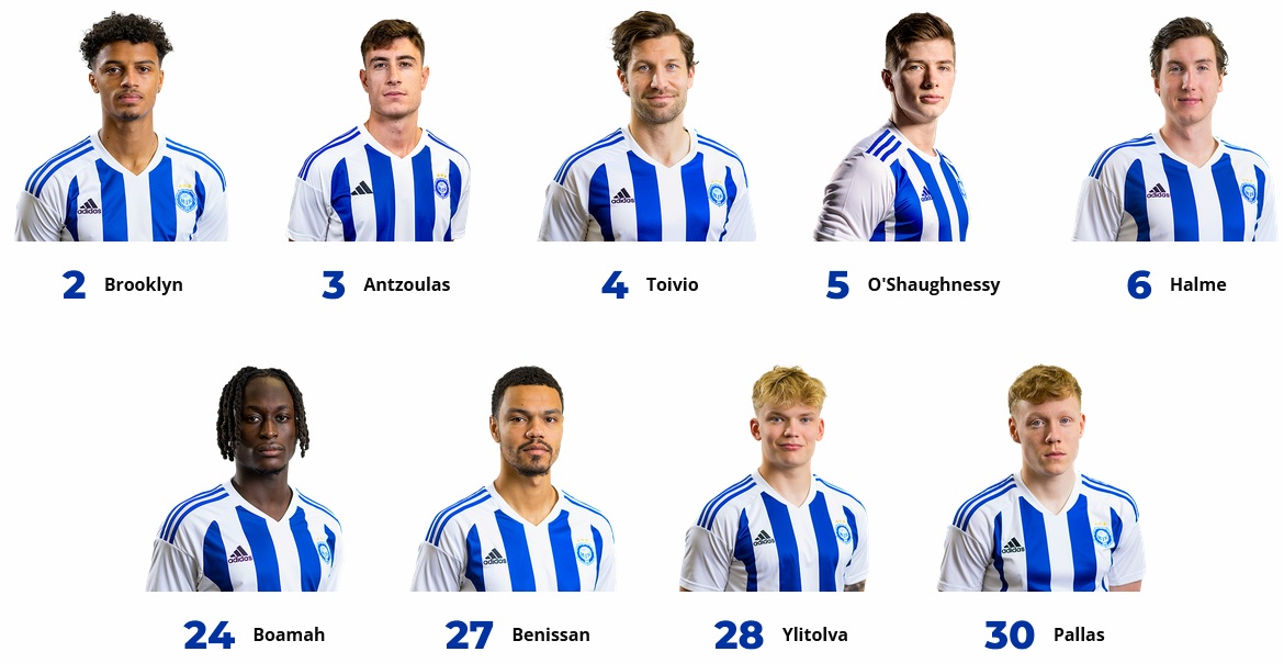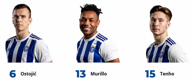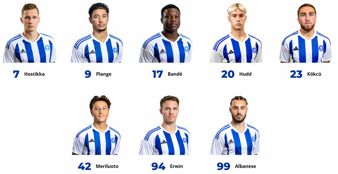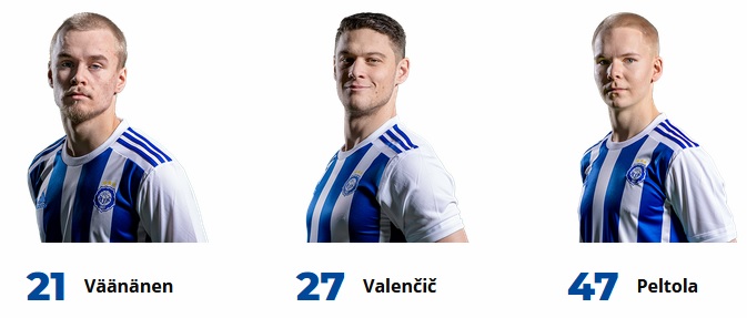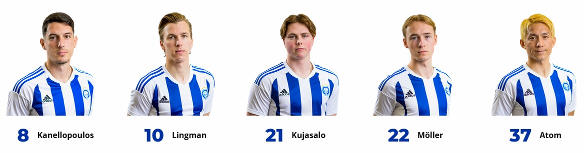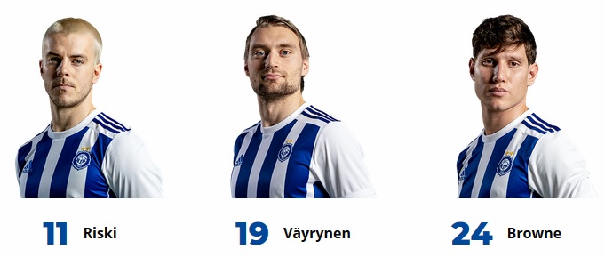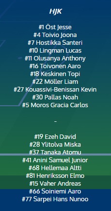 HJK: koko pelin pelanneet: (mv) Jesse Öst, Daniel O'Shaugnessy, Georgios Antzoulas, Lucas Lingman, Ville Tikkanen ja Teemu Pukki.