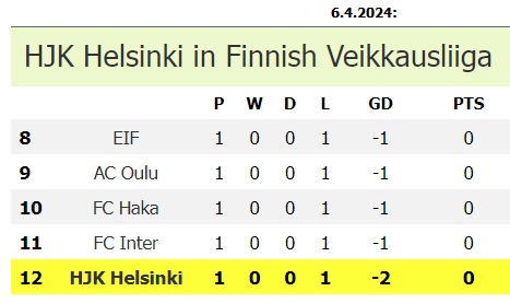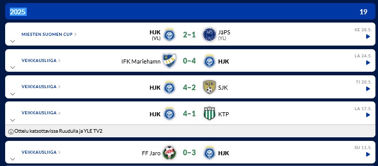 (22.4.2025 * Veikkausliigan 3. kierros): HJK - Gnistan 0-1 * tappio merkitsi HJK:lle historiansa pisintä tappioputkea.