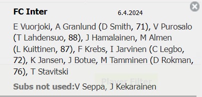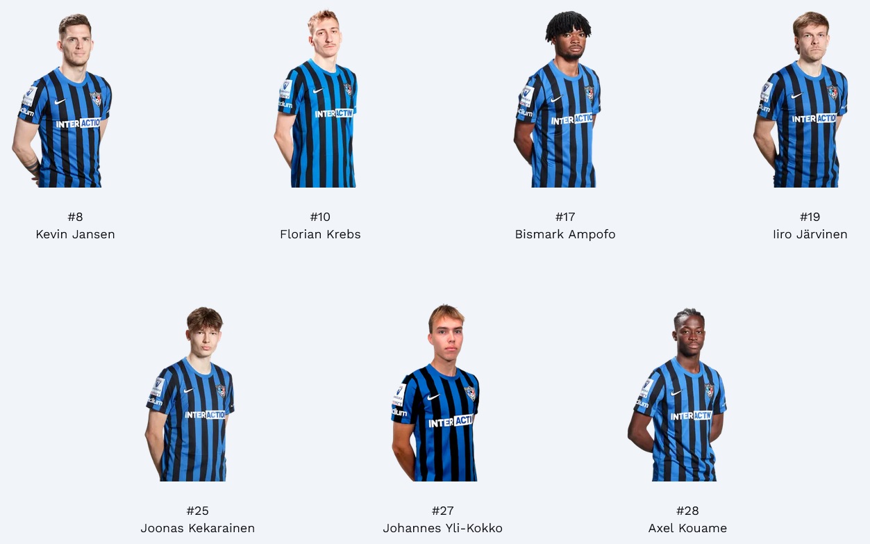 FC Inter: Monsalve, Aho, Nyman, Sanevuori, Lehtonen, Ramirez, Ojala, Pertot (76. Paajanen), Kauko, Nwanganga (79. Purje), Furuholm.