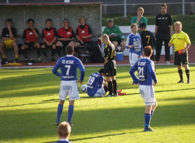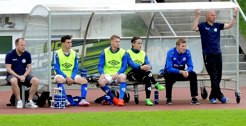 MP:n ilmeeltään uudistunut vaihtopenkkinäkymä FC-Espoo-voittopelin aikana 25.7.2010 (S&J). Kahdeksantoista päivää uutena MP-valmentajana toiminut Janne Wilkman (kuvassa seisomassa vasemmalla) on saamassa kolmannessa MP-työtehtävässään kahdeksan tappio-ottelun putken poikki - MP voitti FC Espoon 2-0.
