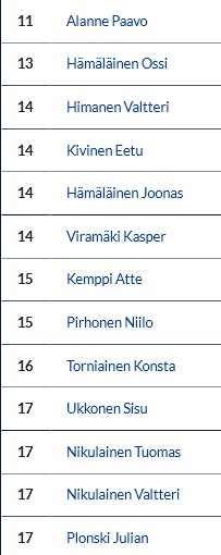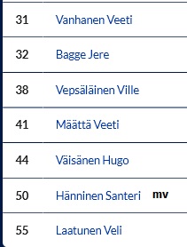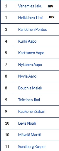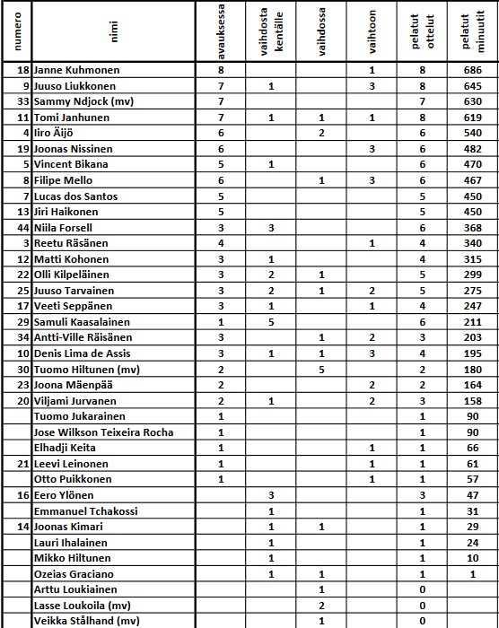 7 Juuso Kangaskorpi, 8 Juuso Kautonen, 9 Miikka Oinonen, 10 Mikko Iivanainen, 11 Mika Roivas,