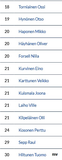 19 Janne Reinikainen, 20 Joonas Laaksonen ja 28 Eetu Muinonen.