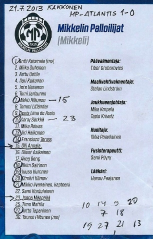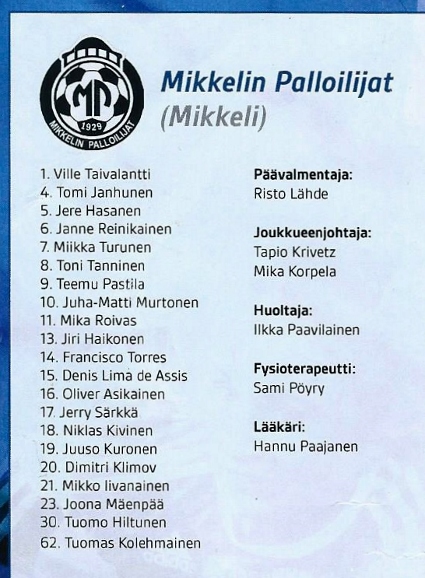 MP:n kokoonpano FC Espoo-ottelussa 25.7.2010: 12 Romppainen Saku, 19 Reinikainen Janne, 10 Iivanainen Mikko, 20 Laaksonen Joonas, 11 Roivas Mika, 17 Sirviö Tuukka, 21 Haikonen Jiri, 15 Koistinen Eetu, 3 Mäenpää Joona, 9 Oinonen Miikka ja 16 Pastila Teemu.