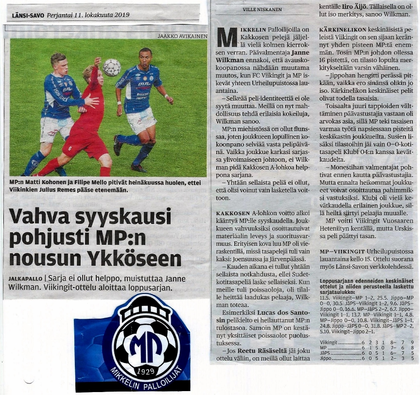 MP nappasi sunnuntaina kauden toisen voittonsa, kun se kaatoi sarjan kärkipäässä porskuttavan FC Espoon kotikentällään lukemin 2-0. Mika Roivas ja Teemu Pastila toimivat MP:n maalintekijöinä.