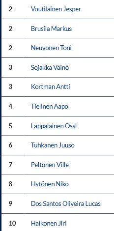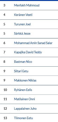 Kenttäpelaajat: 2. Antti Pöyry (C), 3. Teemu Kokko, 4. Lauri Kosunen, 5. Akim Sairinen, 6. Miikka Seppälä, 7. Timo Sariola, 8. Riiko Lappalainen, 9. Sami Kariniitty, 10. Tommi Lifländer, 11. Eetu Pesonen, 13. Tommi Sariola, 14. Mika Hurskainen, 15. Roope Siitari, 16. Juhana Hämäläinen, 17. Faraz Ahadi, 18. Antti Turunen, 19. Eetu Hokkanen, 20. Timo Mattila, 21. Akeg Deng, 22. Ville Teräsranta, 23. Milad Masudi, 24. Ville Peltonen, 26. Lassi Rahikainen ja 30. Samuli Tiirikainen.