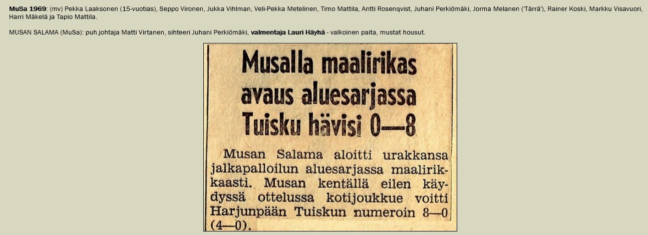 Uuden seuran peliasuksi valikoitui valkoinen paita ja mustat housut - Pertti Junellin ehdotuksen takana oli Mestaruussarjassa pelanneen Valkeakosken Hakan peliuasun värit. MuSa:n ensimmäiseksi jalkapalloilijoiden valmentajaksi nimettiin Matti Vironen (siirtyi myöhemmin RU-38:n pelaajaksi). Perustamiskokouksessa päätettiin Musan Salaman liittyvän TUL-seuraksi, mutta pelaavan kuitenkin SPL:n sarjoissa.