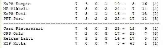 TuTo 3-2. HPK 2-1, ÅIFK 2-2, VaKP 1-1, PS-44 1-1, IFFK 0-0, Pyrkivä 2-0, Ässät 2-1, TaPa 2-0, RaPa 2-0 ja TPV 2-2.