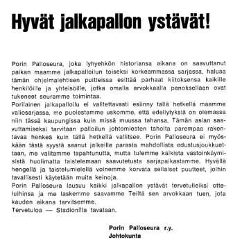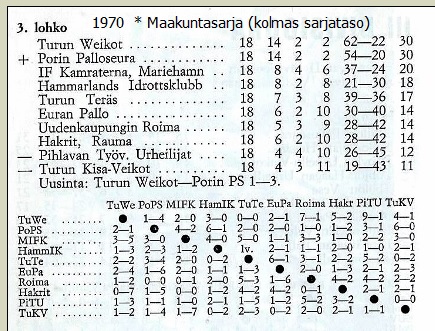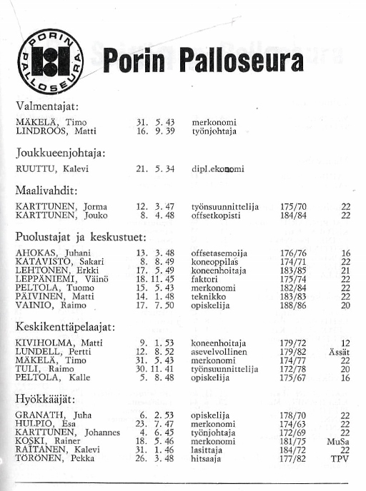 Jalkapallokirja 1973: Porin Palloseura (PoPS) ~ palloj.pj Kalevi Ruuttu, sihteeri Pertti Ekberg, valmentaja Timo Mäkelä, apuvalmentaja Matti Lindroos, paita puna-mustaraidallinen, housut mustat, sukat puna-mustat.