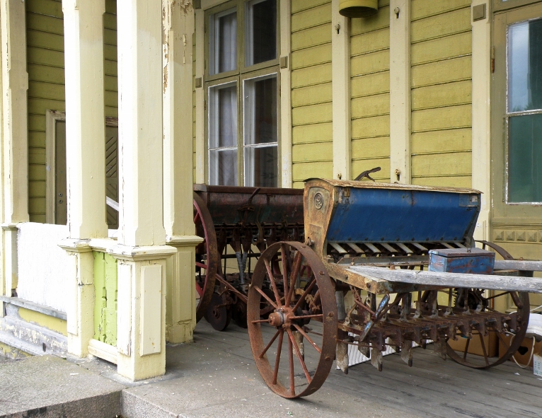 Myllymäen rautatieasema kuvattuna 16.7.2011 (S&J). Aseman kuistille kerätty vanhoja maataloustyökaluja.