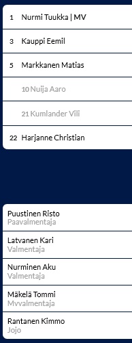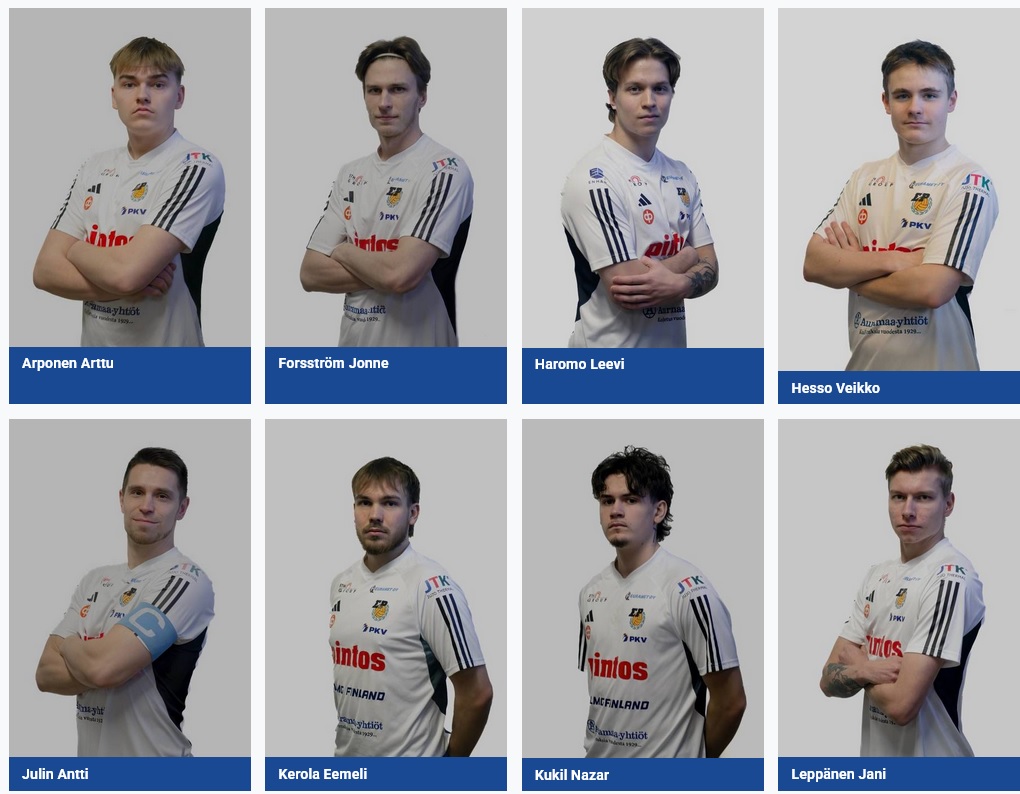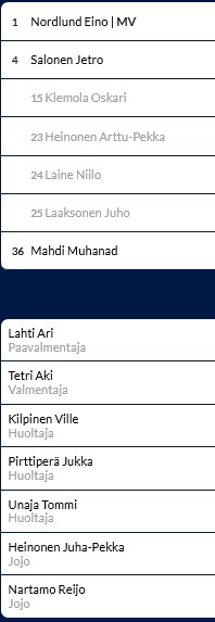 25 Erama Panu, 10 Forsström Jonne, 23 Helkiö Aleksi, 21 Kerola Eemeli, 4 Leino Joonas,
