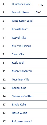 25 Rissanen Riku, 15 Ruohola Antti-Pekka, 11 Salminen Eetu,