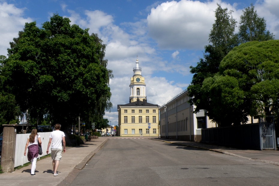 Rauhankatua pitkin näkymä ympyräkaupungin keskipisteeseen - kuvattu 19.4.2015 (S&J). Raatihuone ja Johanneksen kirkko.