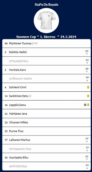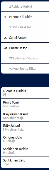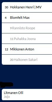 Vaihtoon: (p) Tony Haapanen, (k) Niklas Åhlgren, (k) Tomi Pimiä, (h) Otto Lahikainen ja (h) Markus Tukiainen * Vaihdosta: Samuel Lindgren, Aku Talka, Nico Haapanen, Jonni Stockus ja Nuutti Manninen.