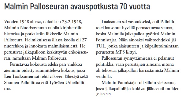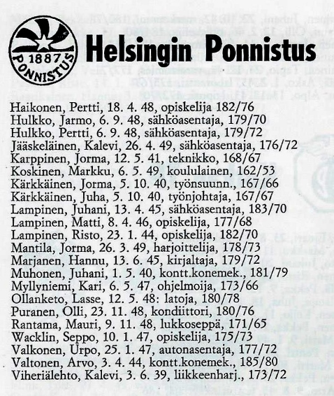 V- ja U-seura Ponnistus (Ponnistus) - puheenjohtaja E.Hämäläinen - sihteeri Esko Piipponen - huoltaja E.Puntti - paita musta-valkoraitainen, housut mustat.