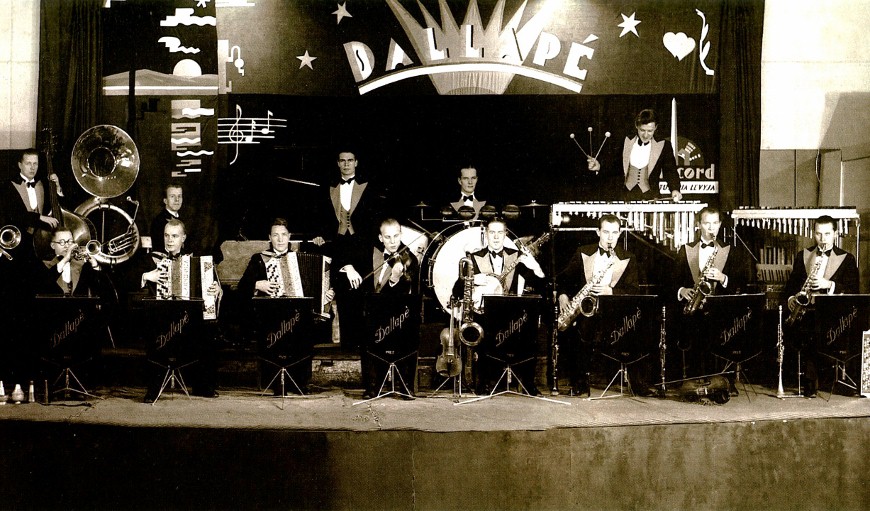 Dallapé Heimolan lavalla talvella 1933-34. Soittajat vasemmalta oikealle: (Nils Lindfors - rajautunut pois), Eero Lindroos, Alvar Kosonen, Viljo Vesterinen, Asser Fagerström (pianon ääressä takana), Martti Jäppilä, Aimo Andersson (A.Aimo), Mauno Jokinen, Jorma Leino, Helge Pahlman, Pauli Impivaara, Eino Katajavuori, Tommy Tuomikoski ja Paavo Raivonen. Viulisti Mauno Jokisen tie vei toisen maailmansodan jälkeen Venezuelaan, jonne hänen jälkensä katosivat. Kuva ja tiedot kirjasta Tanssiorkesteri Dallapé (Tikka-Tamminen). Kuvaajan nimeä ei kirjasta löydy.