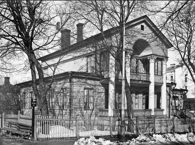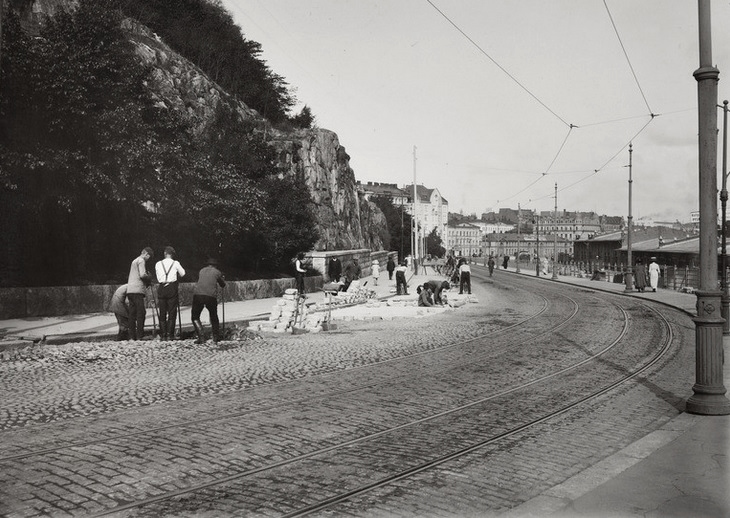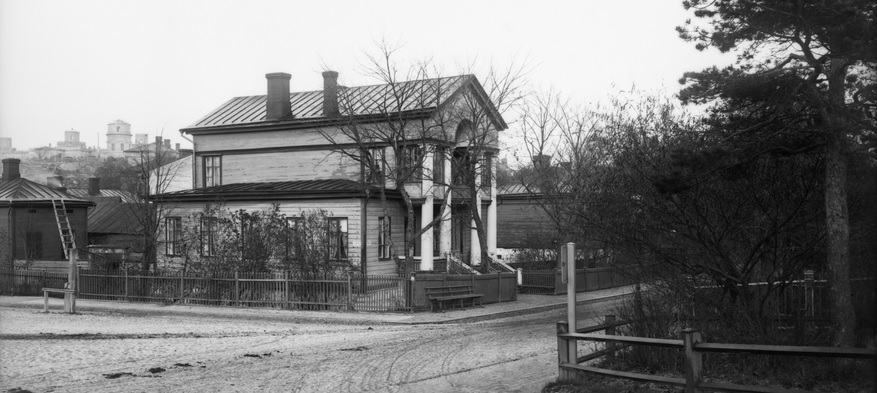 Näkymä Tähtitornin vuorelta kaakkoon, etualalla satamarata ja Saunakatu (nyk. Laivasillankatu). Oikealla Etelärannan laivatelakan alue. Taustalla Kaivopuistoa, mm. Villa Kalliolinna, Huvilatie 16, (nyk. Kalliolinnatie 12) ja Cygnaeuksen galleria. Rakennuksissa juhlaliputus. Oikealla takana tuulimylly Myllykalliolla nykyisen Myllytie 4:n kohdilla. Kuvaaja: Otto Johansson (1890-luku) * (Helsingin kaupunginmuseo, CC BY 4.0).