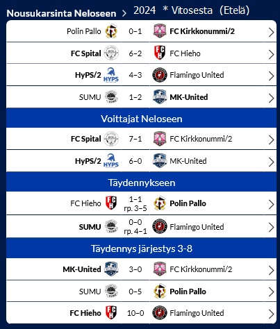 HUOM! Koska HyPS putosi kauden 2024 päätteeksi Neloseen, HyPS/2 ei (ilmeisesti) halunnut käyttää nousumahdollisuuttaan myös Neloseen.